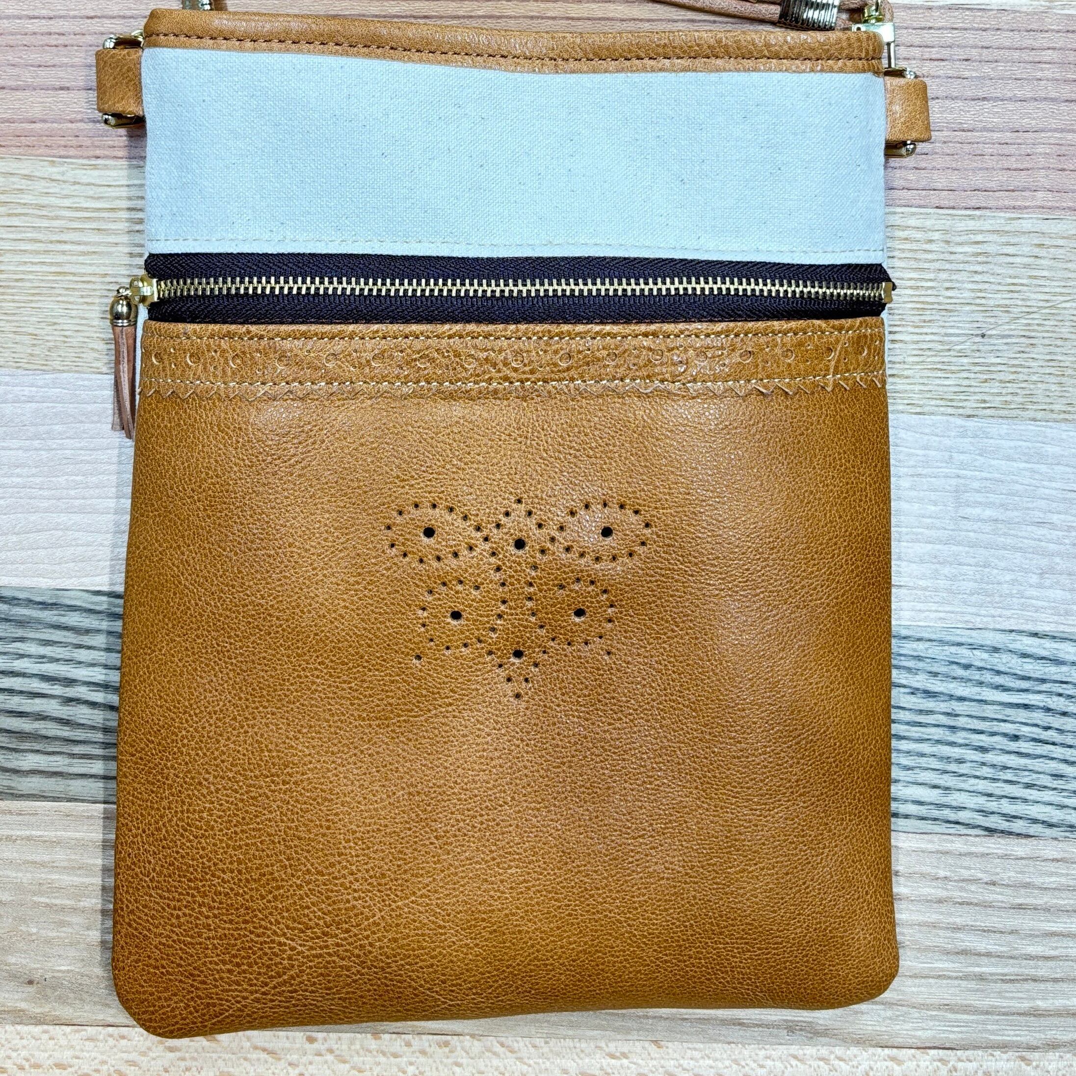【本革×帆布】手縫いレザーサコッシュ〈ブラウン 蝶柄 金具色:ゴールド〉|一点物 ミニショルダーバッグ | 男女兼用 ハンドメイド 革バッグ