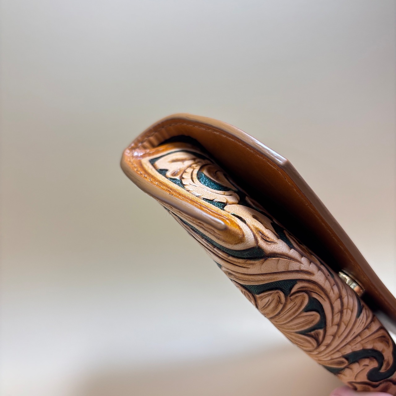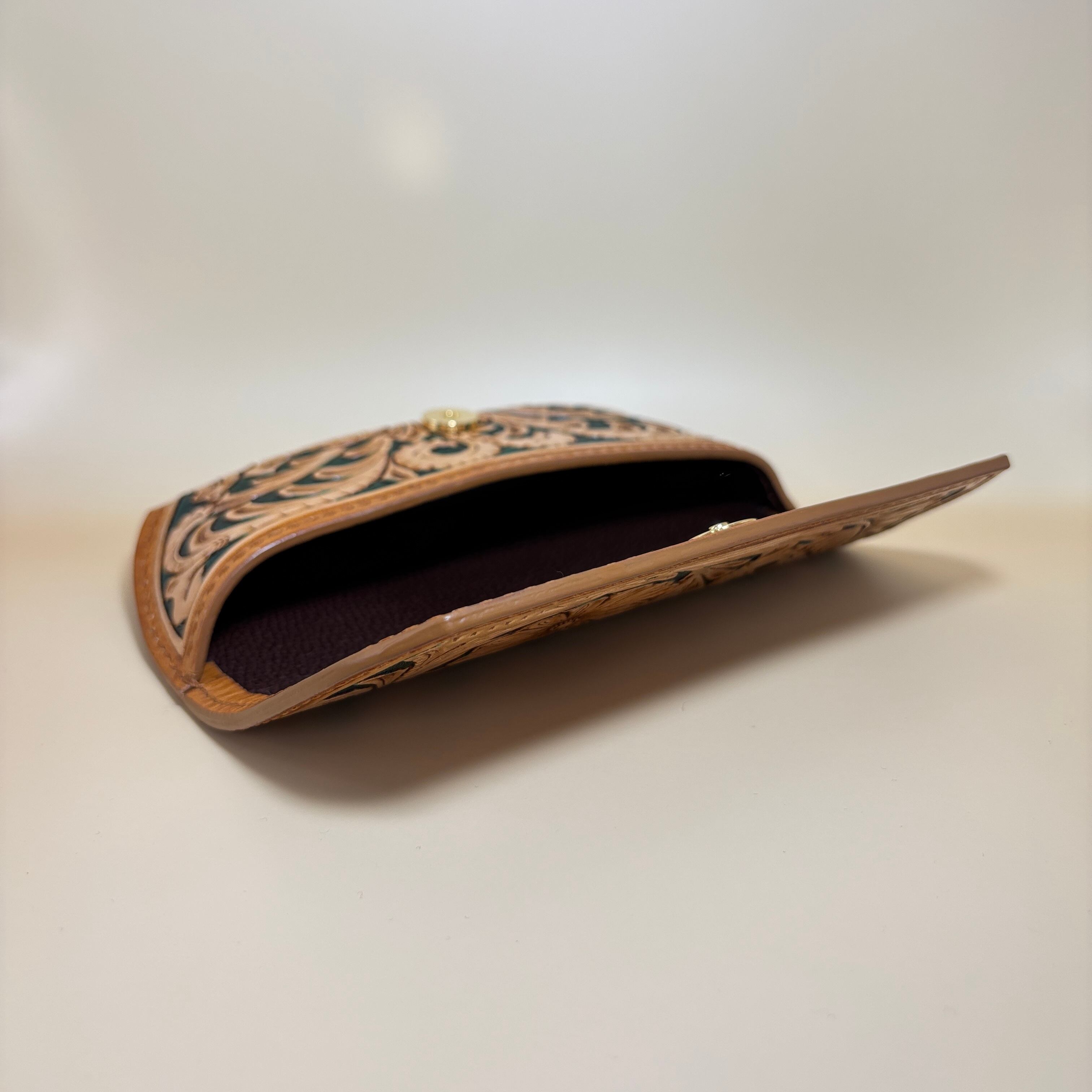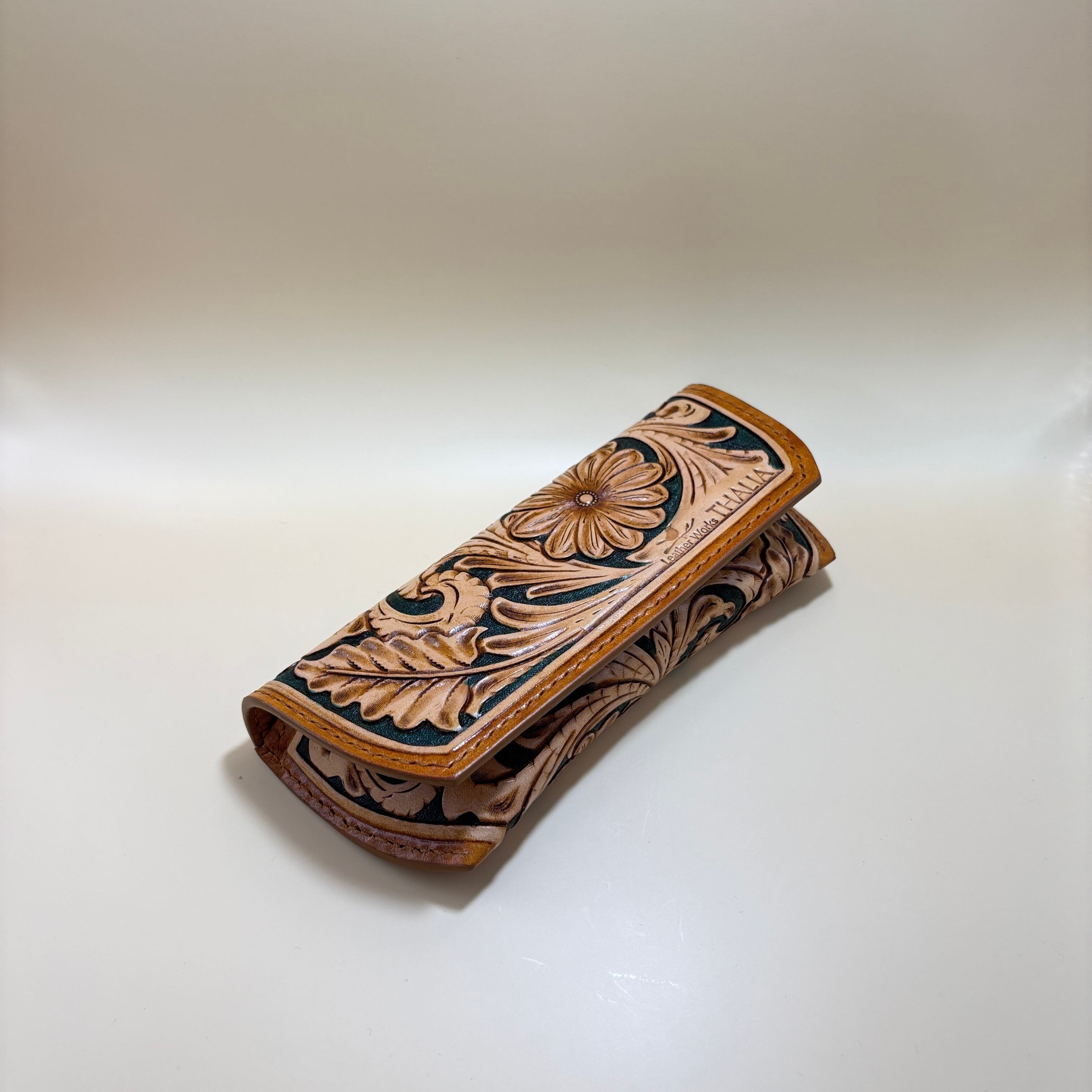 【本革 手縫い】レザーカービング メガネケース サングラスケース エメラルドグリーン | シェリダンスタイルの一点物 眼鏡ケース サングラスケース | ハンドメイド 革小物