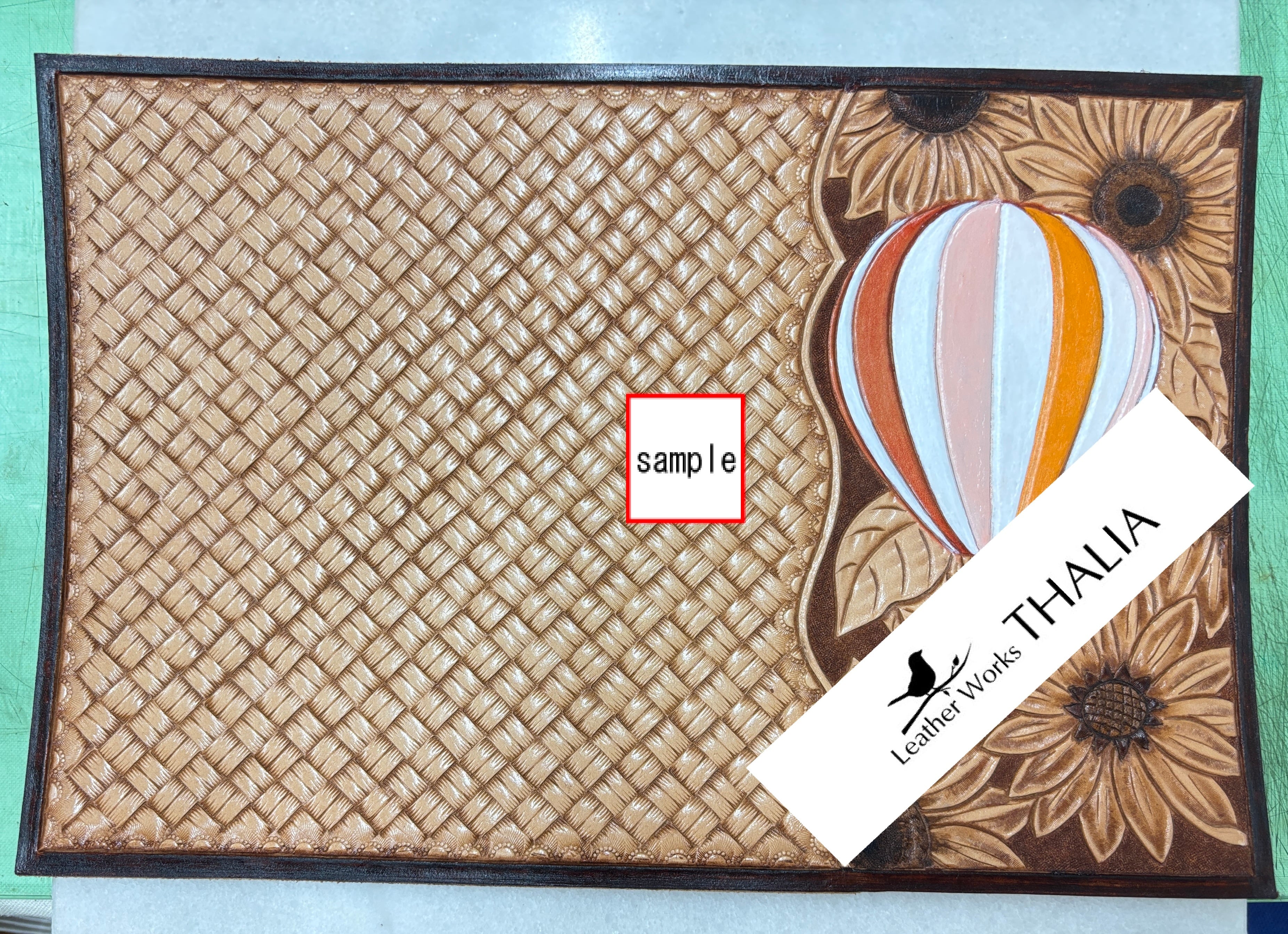 ヒマワリの中に大きめの気球を配した、ユニークで印象的なレザーカービング図案です。