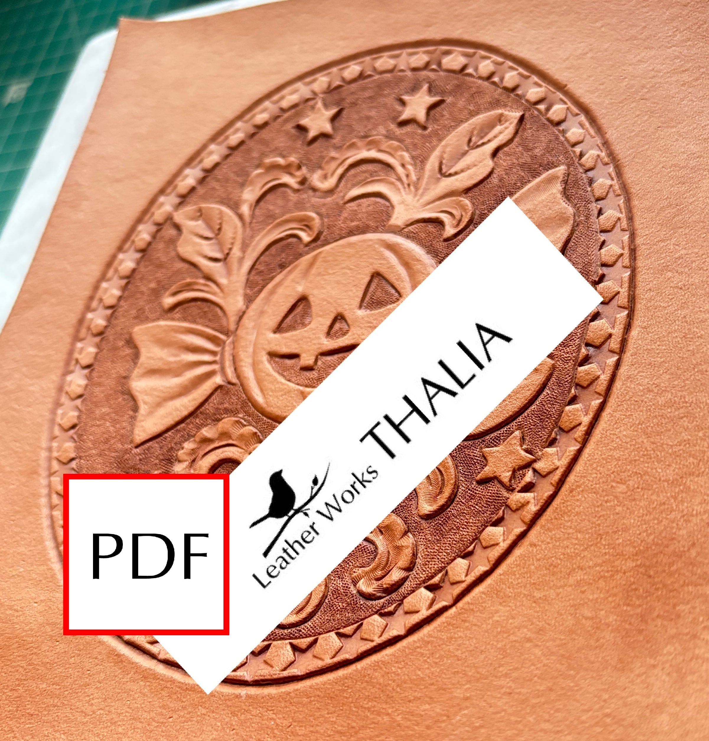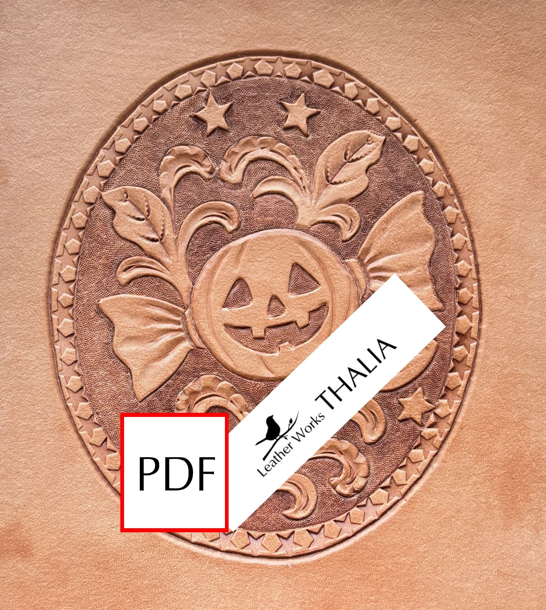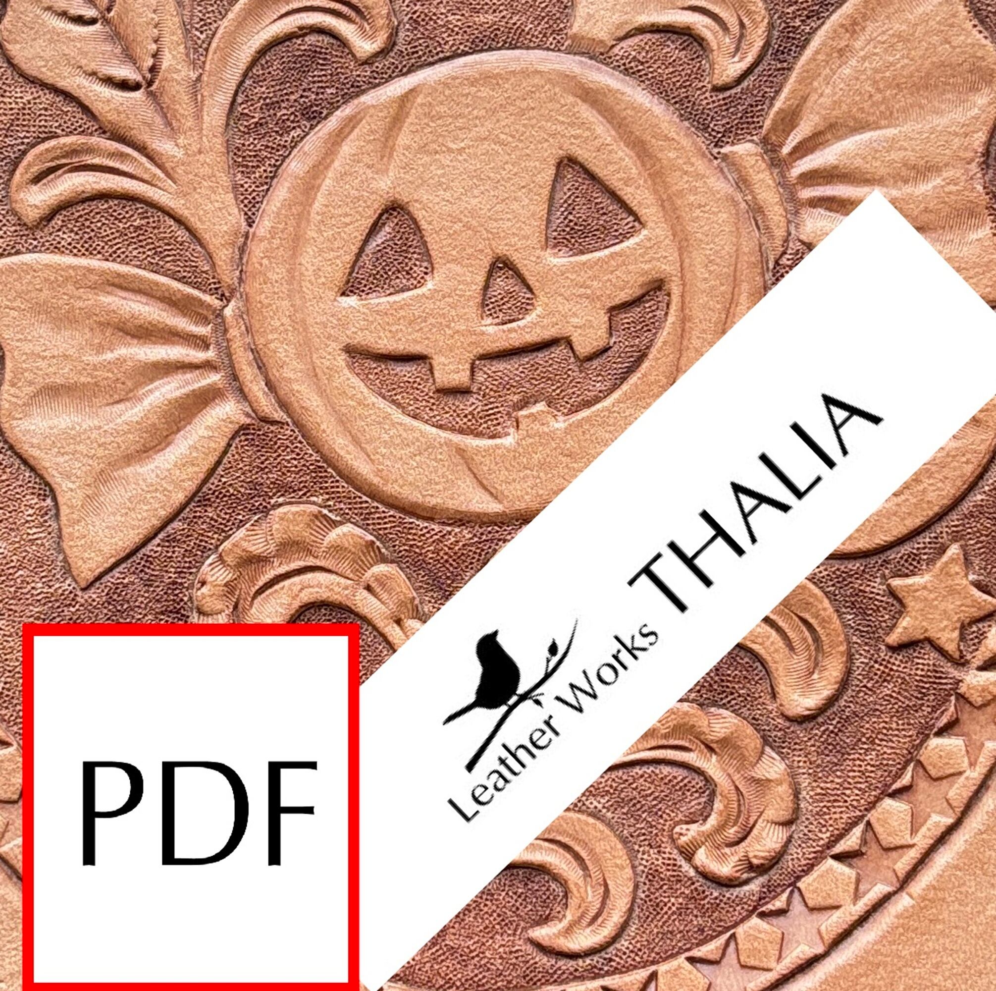 ハロウィンキャンディとシェリダンスタイルの唐草を組み合わせた、楽しく可愛らしいレザーカービング図案です。