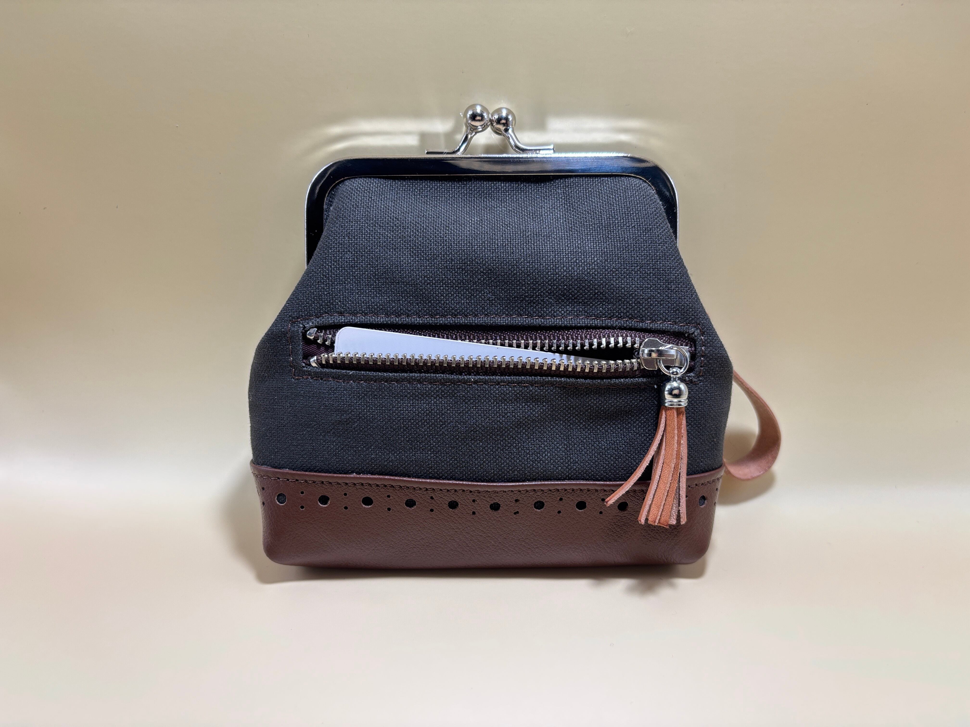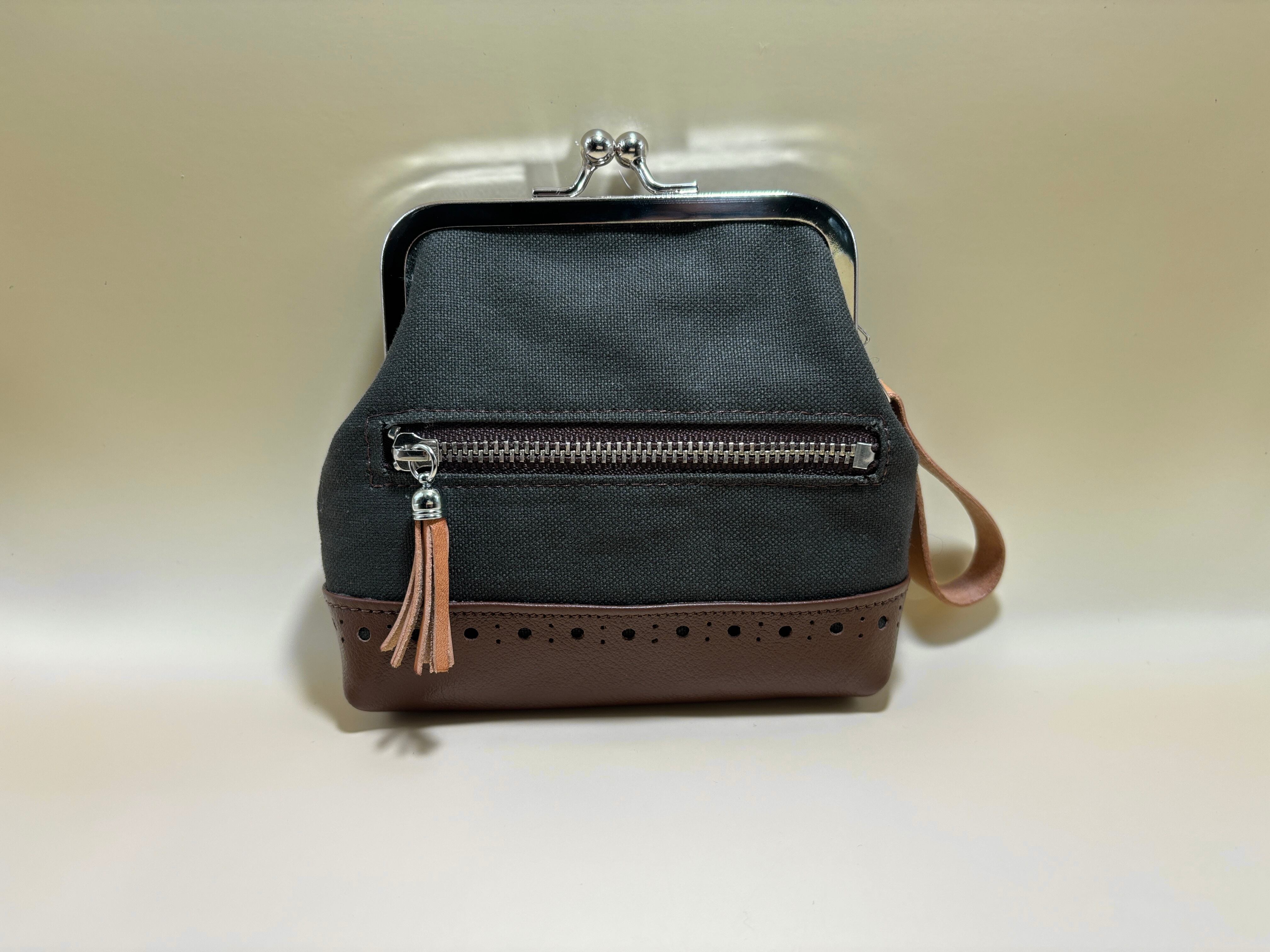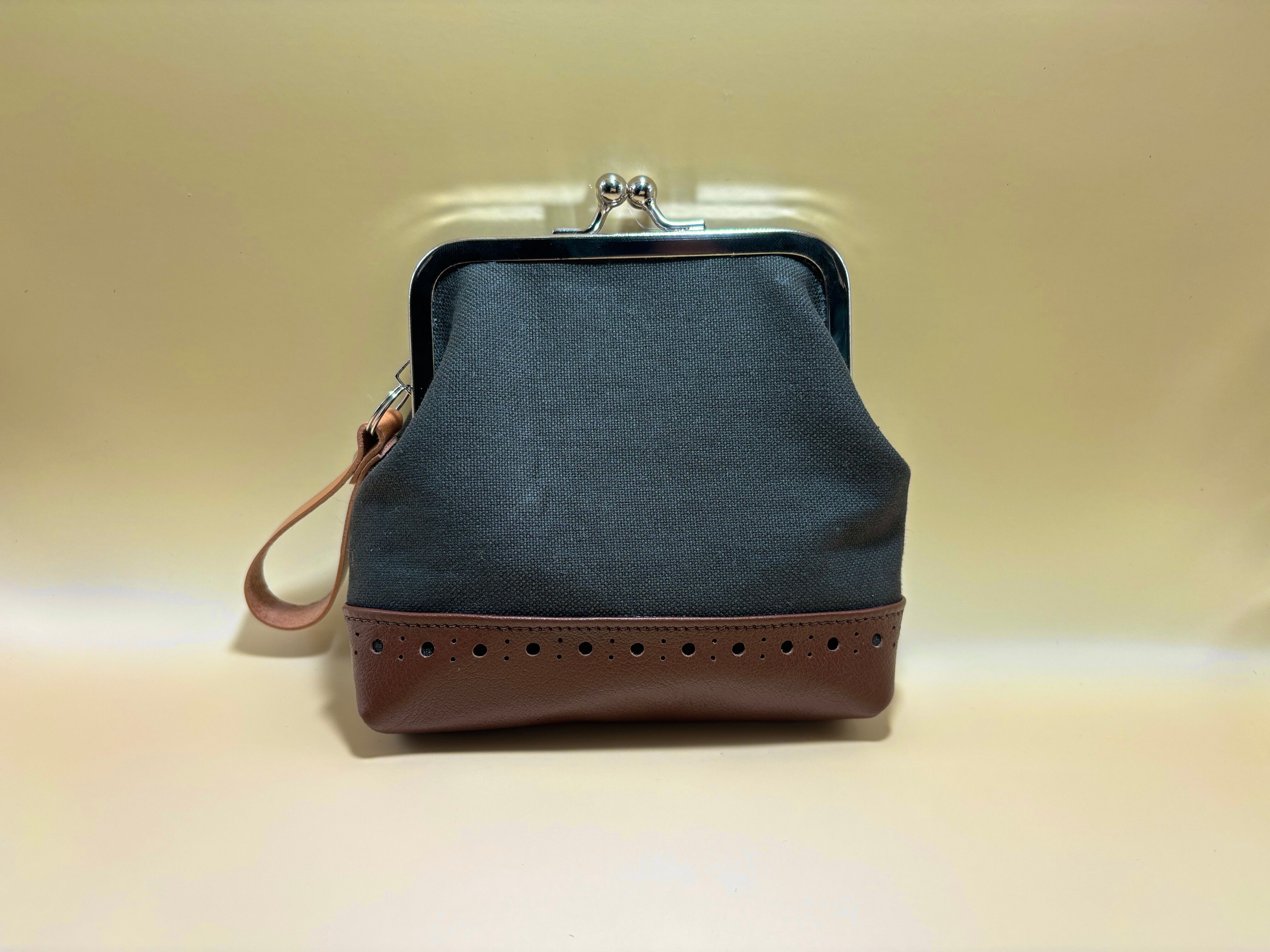 カードが入る ファスナーポケット付きミニポーチ | 帆布×本革|がま口仕様|ディープカーキ×ブラウン | ギフトにも