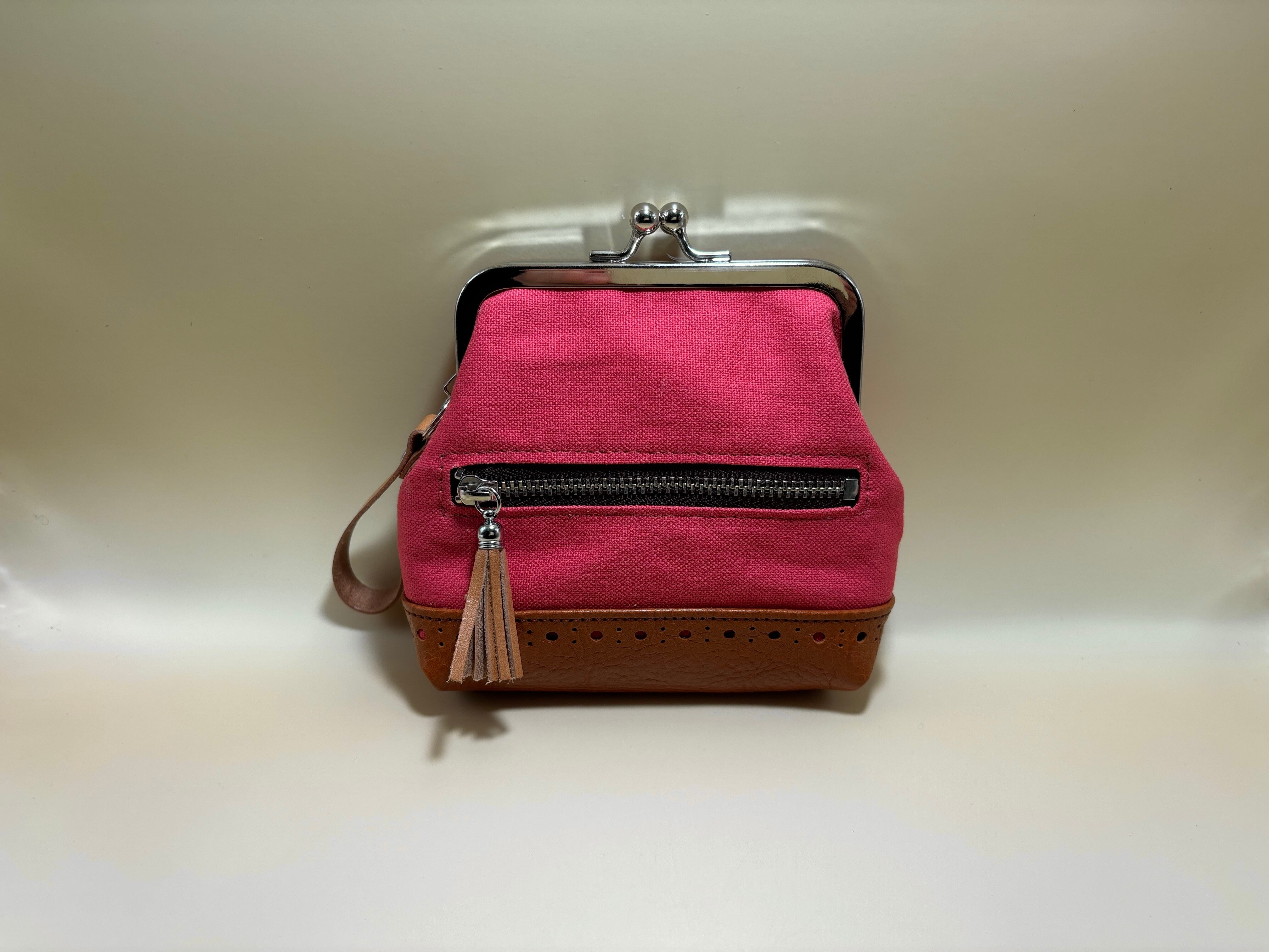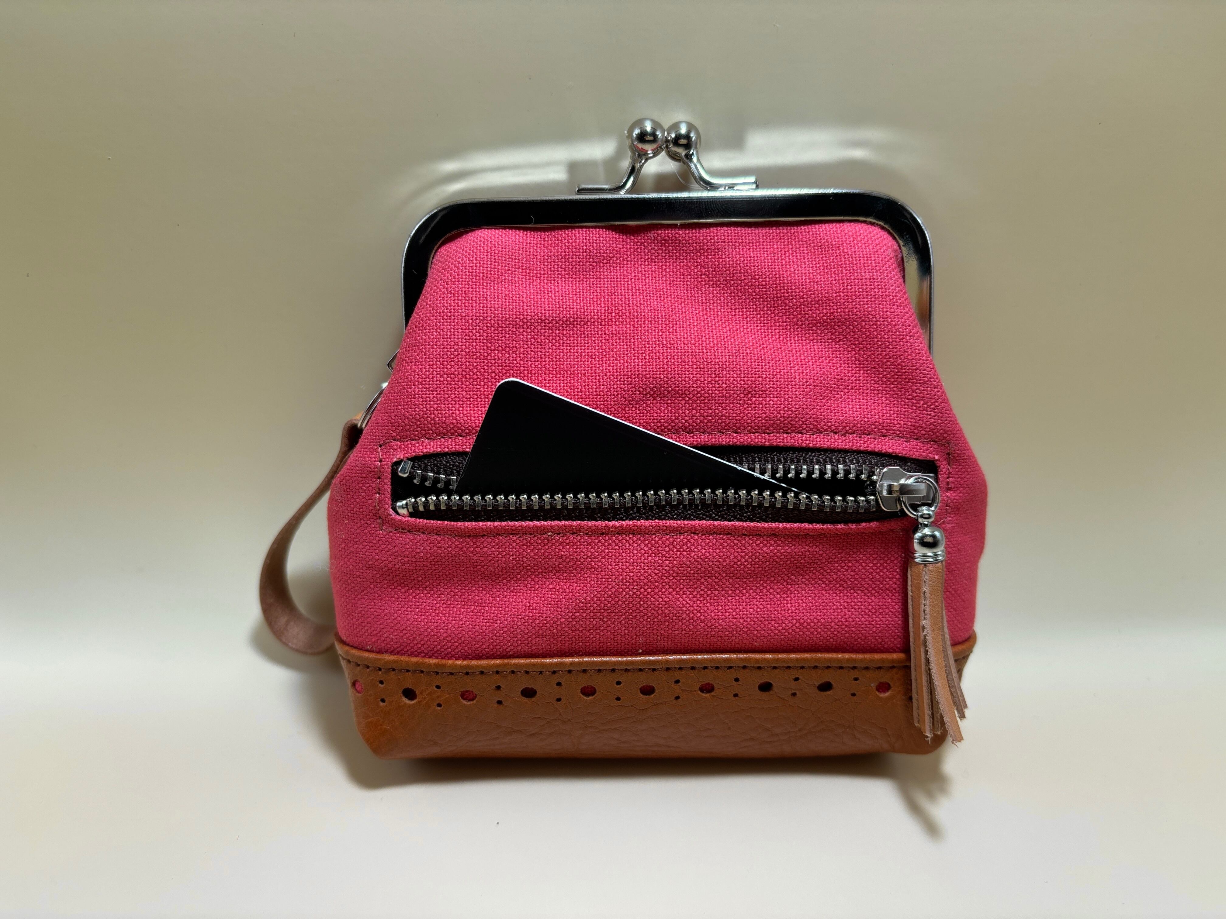 カードが入る ファスナーポケット付きミニポーチ | 帆布×本革|がま口仕様|ダスティピンク × キャメル | ギフトにも