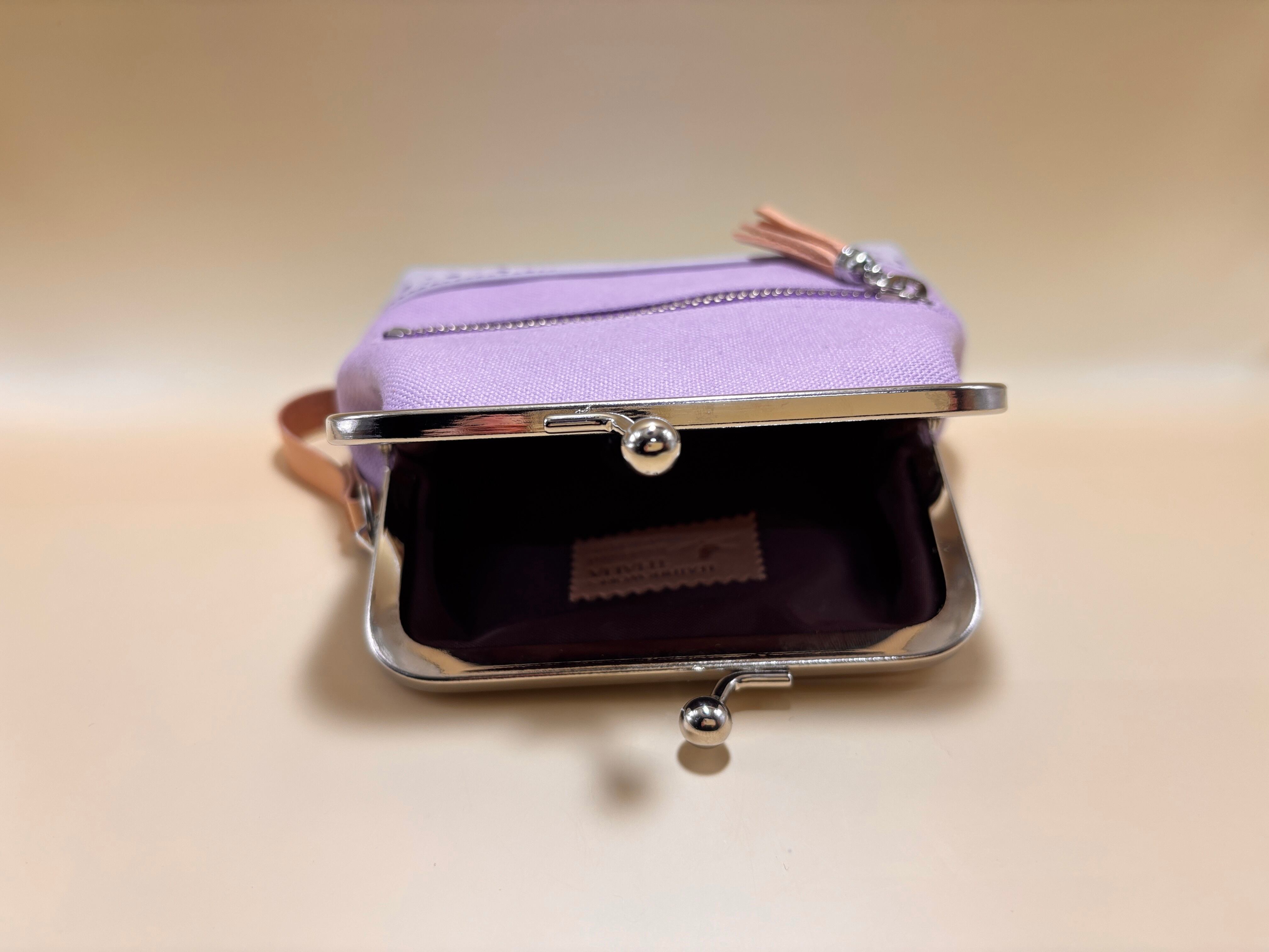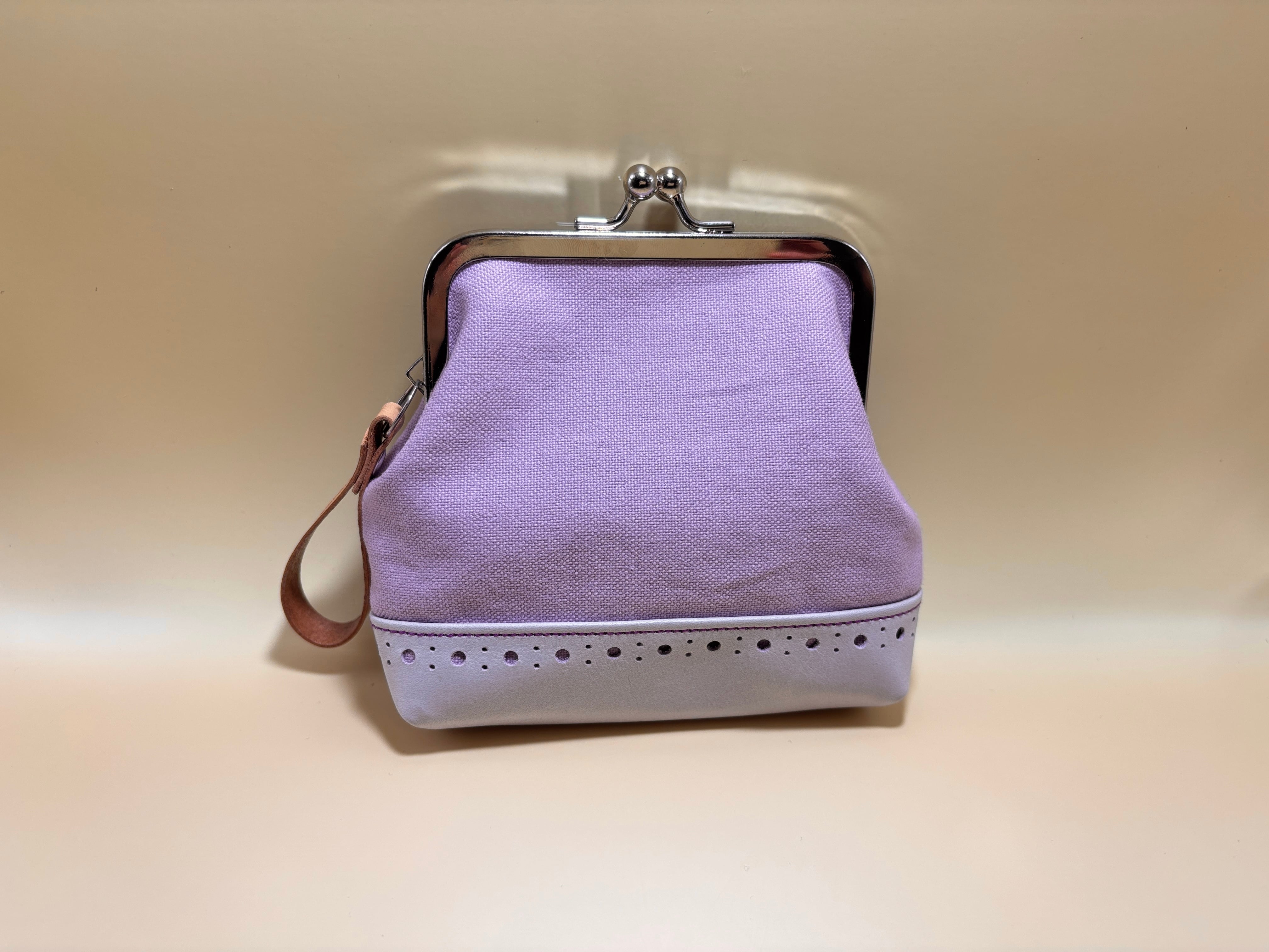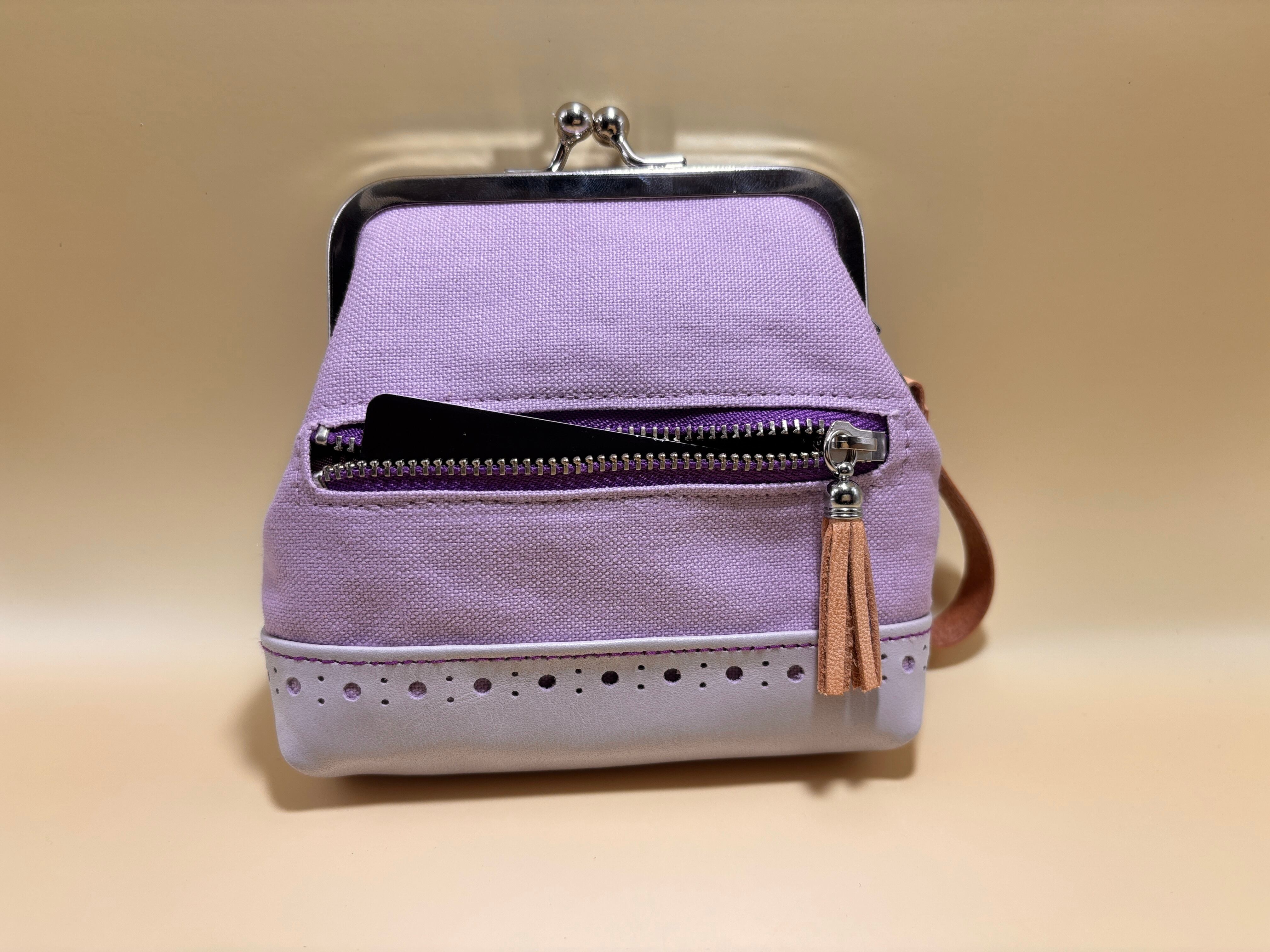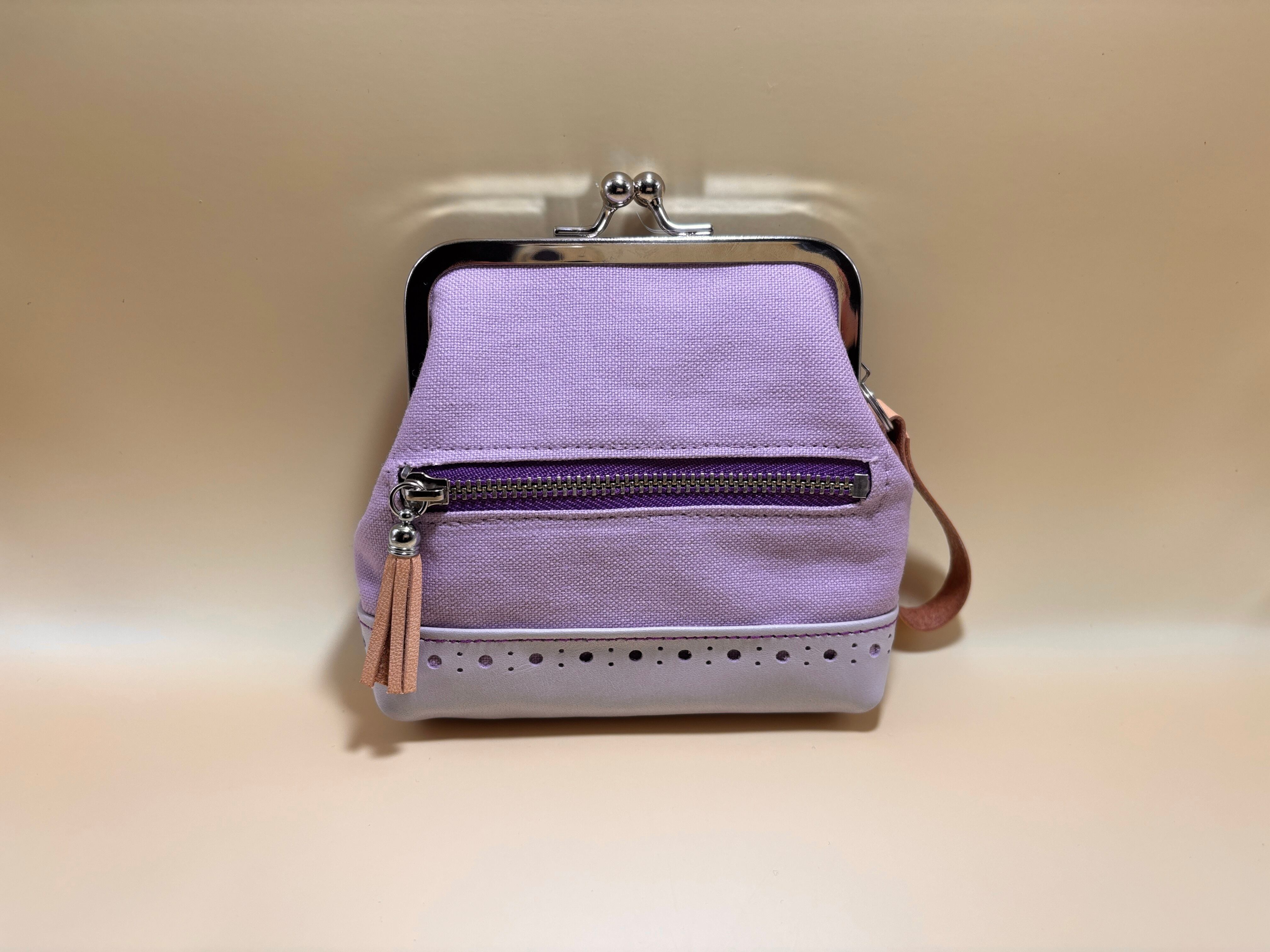 カードが入る ファスナーポケット付きミニポーチ | 帆布×本革|がま口仕様|ラベンダーグレー × ペールラベンダーグレー | ギフトにも